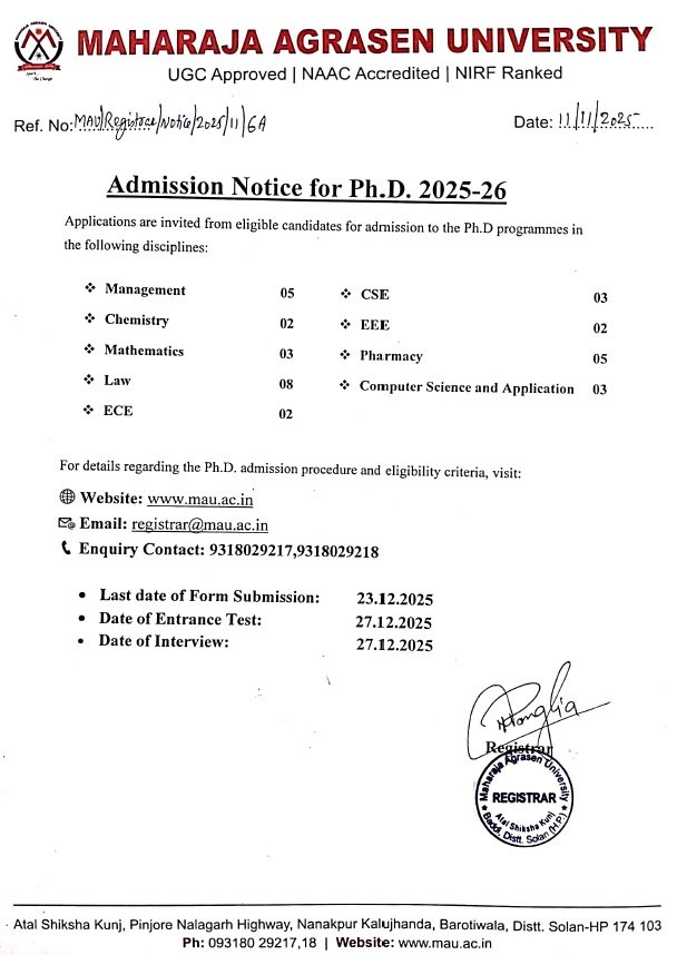 17th November 2025 Admission Notice for PhD 2025-26 |