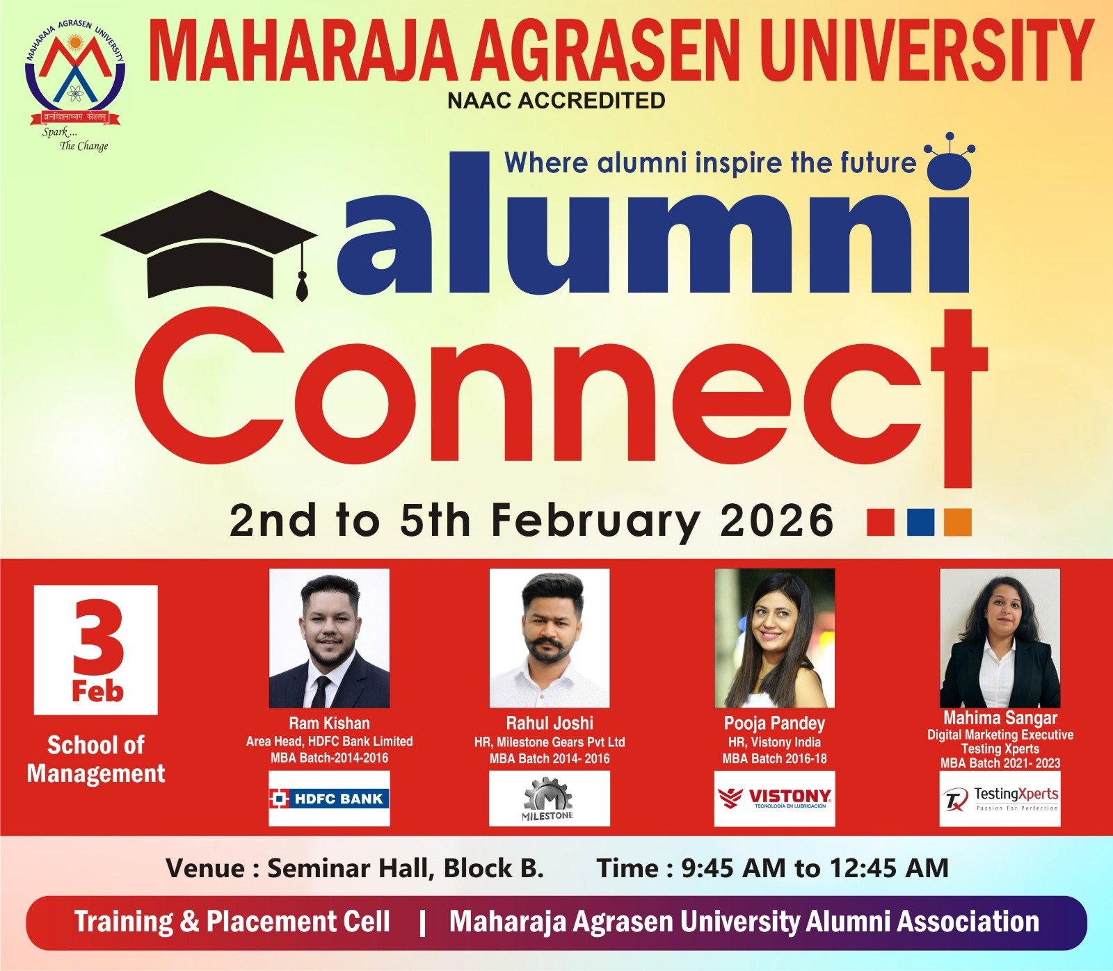 30th January 2026 Maharaja Agrasen University, Baddi proudly organising Alumni Connect-MASOM on 3rd February 2026 |